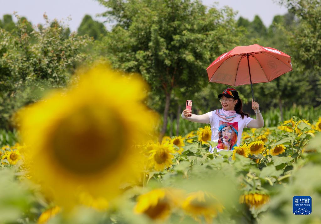 6月23日,游客在山東省滕州市張汪鎮大宗村向日葵基地游玩拍照。