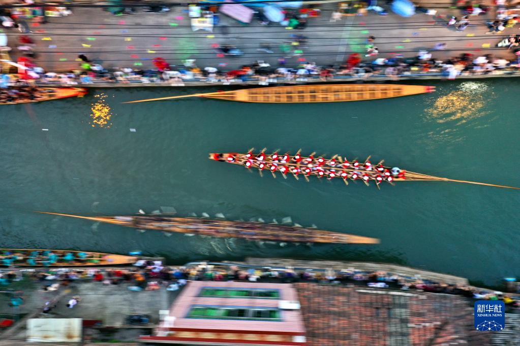龍舟在福州市長(cháng)樂(lè )區三溪村穿村而過(guò)的小溪中競渡(2023年6月18日攝,無(wú)人機照片)。
