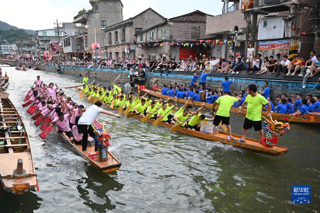 人們在福州市長(cháng)樂(lè )區三溪村穿村而過(guò)的小溪中劃龍舟(2023年6月20日攝)。