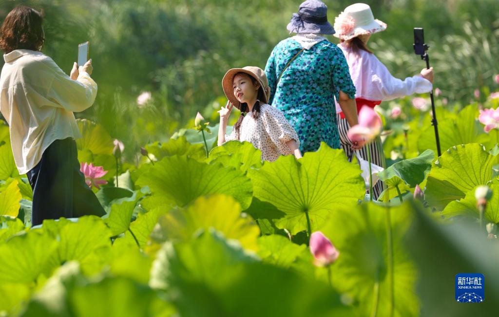 6月24日,游人在湖北省襄陽(yáng)市月亮灣濕地公園拍照、賞荷。