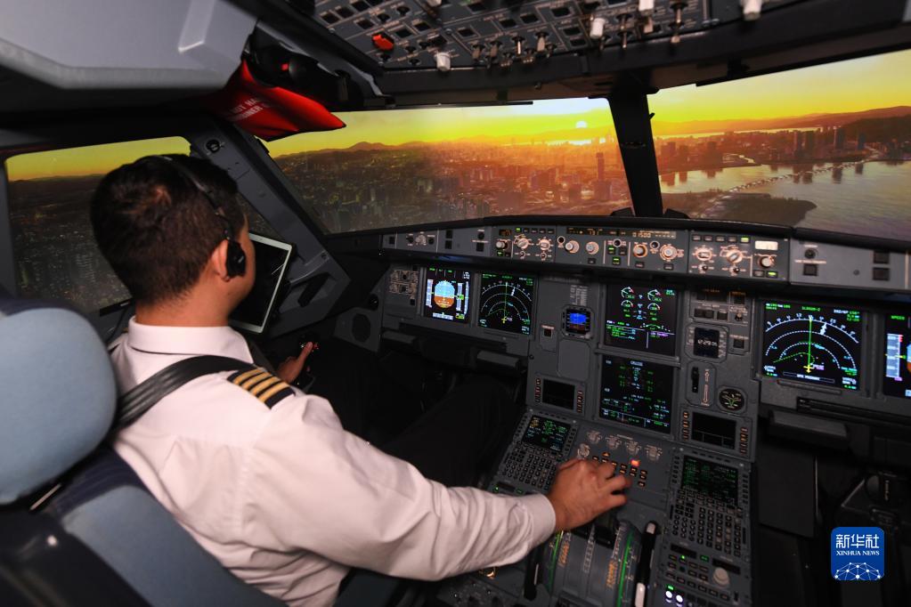 在廣東珠海翔翼飛行訓練中心,飛行員在模擬機中模擬飛越深圳城市上空(6月13日攝)。