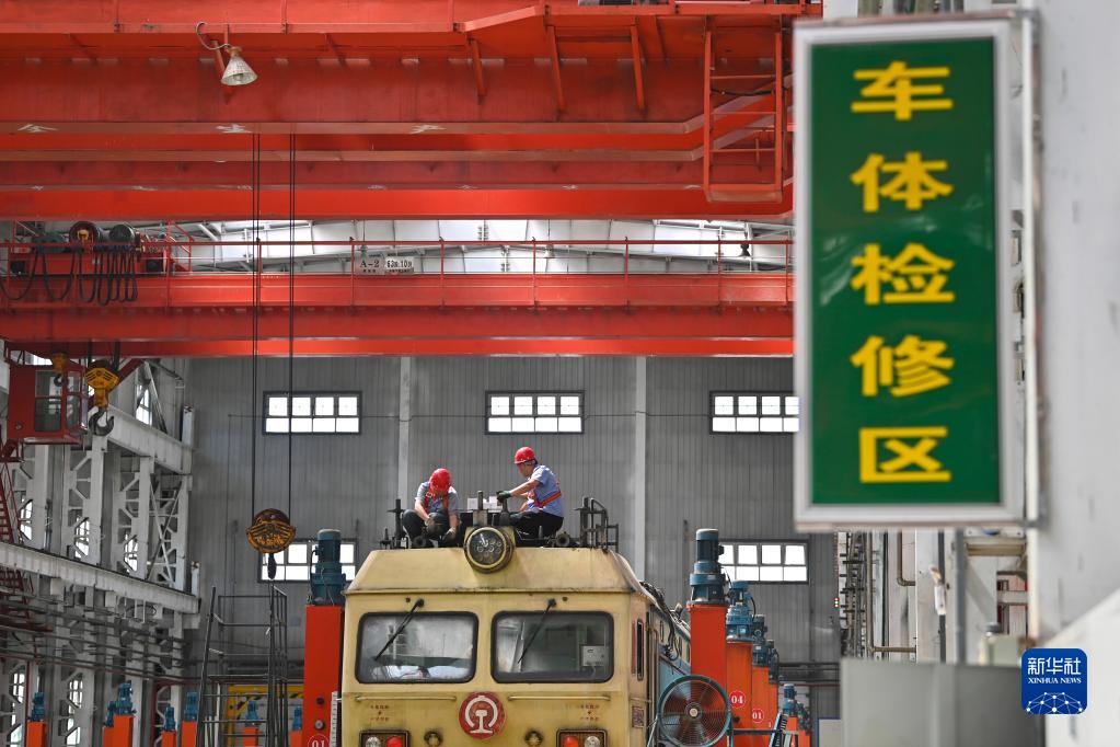 在中國鐵路太原局集團有限公司太原機務(wù)段太北檢修車(chē)間,工作人員對貨運機車(chē)進(jìn)行檢修(6月20日攝)。