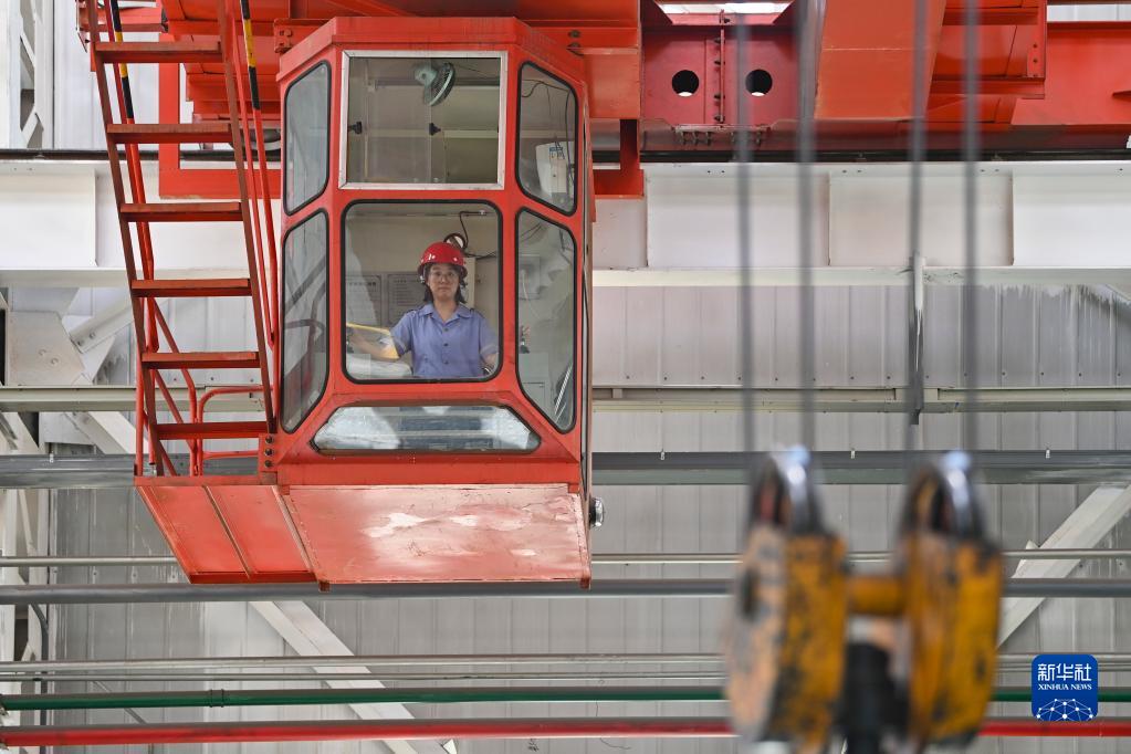 在中國鐵路太原局集團有限公司太原機務(wù)段太北檢修車(chē)間,天車(chē)司機王孟媛在天車(chē)上作業(yè)(6月20日攝)。
