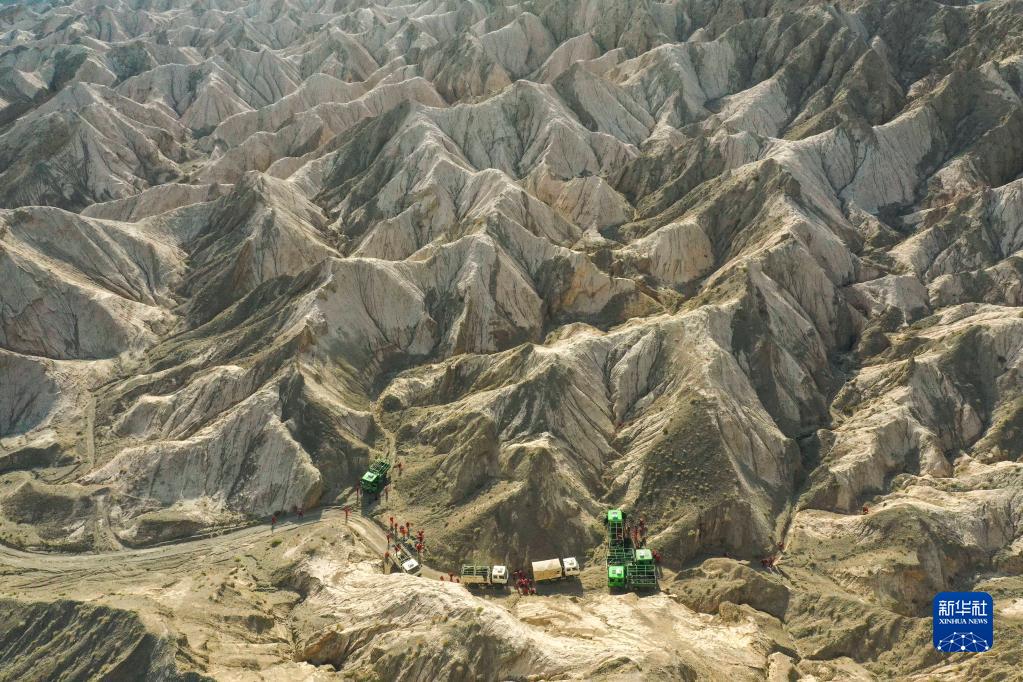 東方物探公司塔里木物探處2170隊放線(xiàn)班組的工人乘車(chē)抵達施工山區,在山腳整理檢波器,即將開(kāi)始登山(6月20日攝,無(wú)人機照片)。