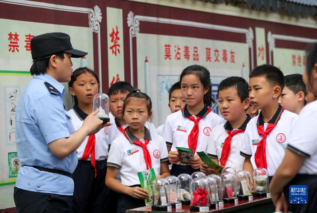 6月25日,民警在貴州省開(kāi)陽(yáng)縣第二小學(xué)禁毒園地為學(xué)生講解禁毒知識。
