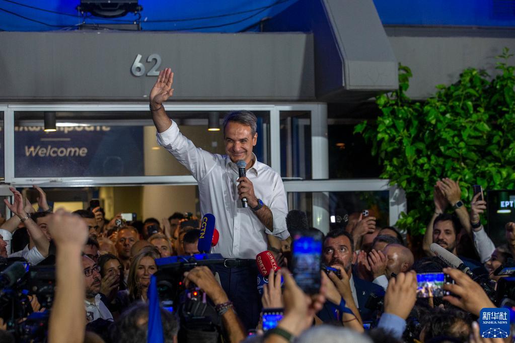 6月25日,希臘新民主黨領(lǐng)導人基里亞科斯·米佐塔基斯在雅典與支持者慶祝該黨派贏(yíng)得選舉。