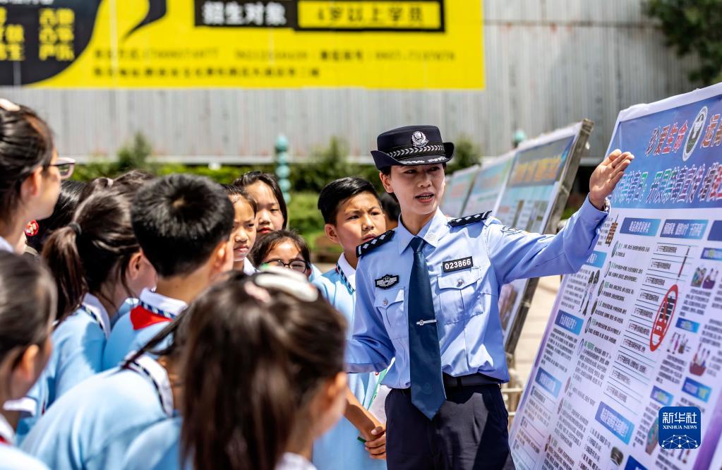 6月26日,在貴州省黔西市水西廣場(chǎng),民警向學(xué)生宣傳禁毒知識。