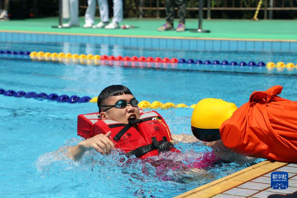 6月26日,在第六屆中國海員技能大比武鐵人三項接力項目現場(chǎng),選手準備拖帶模擬溺水人員回游。