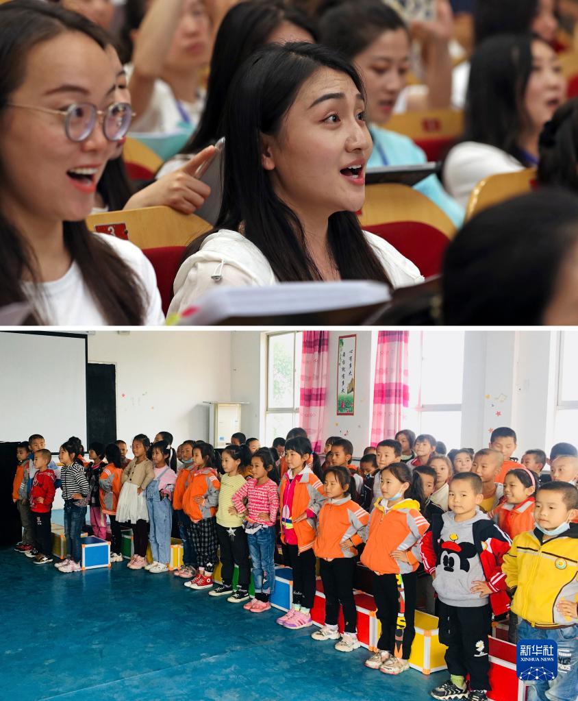 這是一張拼版照片:上圖為6月23日,陜西省渭南市澄城縣王莊鎮劉家洼學(xué)校的音樂(lè )教師高燕在培訓課上(新華社記者劉穎攝);下圖為劉家洼學(xué)校的星光童聲合唱團在排練,該團由高燕老師組建并命名,她希望歌唱“能讓孩子們的眼睛像星光一樣閃亮”(受訪(fǎng)者供圖)。