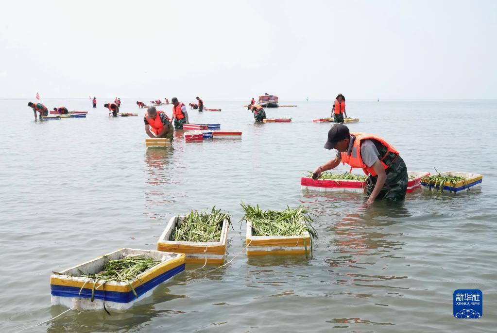 6月25日,中船環(huán)境集團的工人在唐山市曹妃甸區海洋生態(tài)保護與修復項目海域栽種鰻草苗。