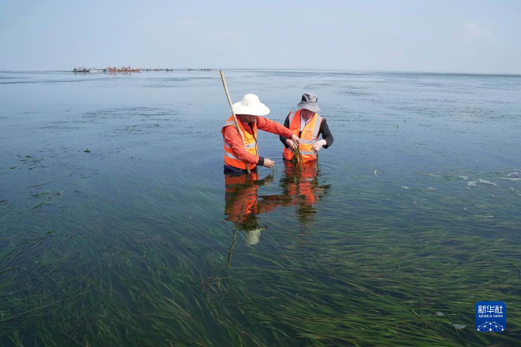 6月25日,中船環(huán)境集團的工人在唐山市曹妃甸區海洋生態(tài)保護與修復項目鰻草苗采集海域工作(無(wú)人機照片)。