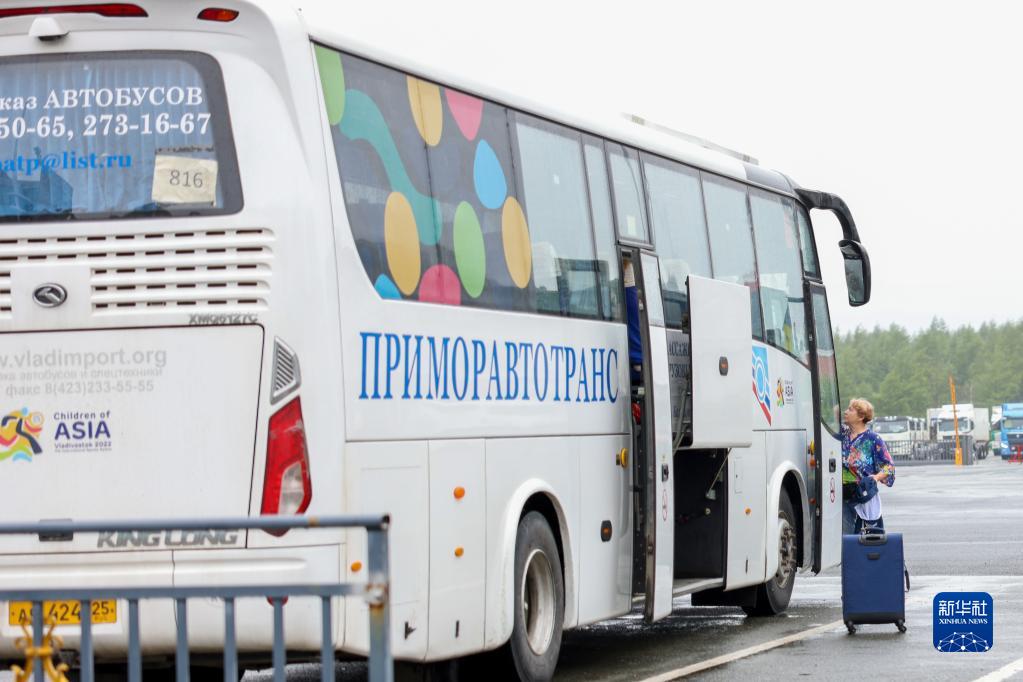 6月27日,旅客在琿春公路口岸乘坐旅游巴士。