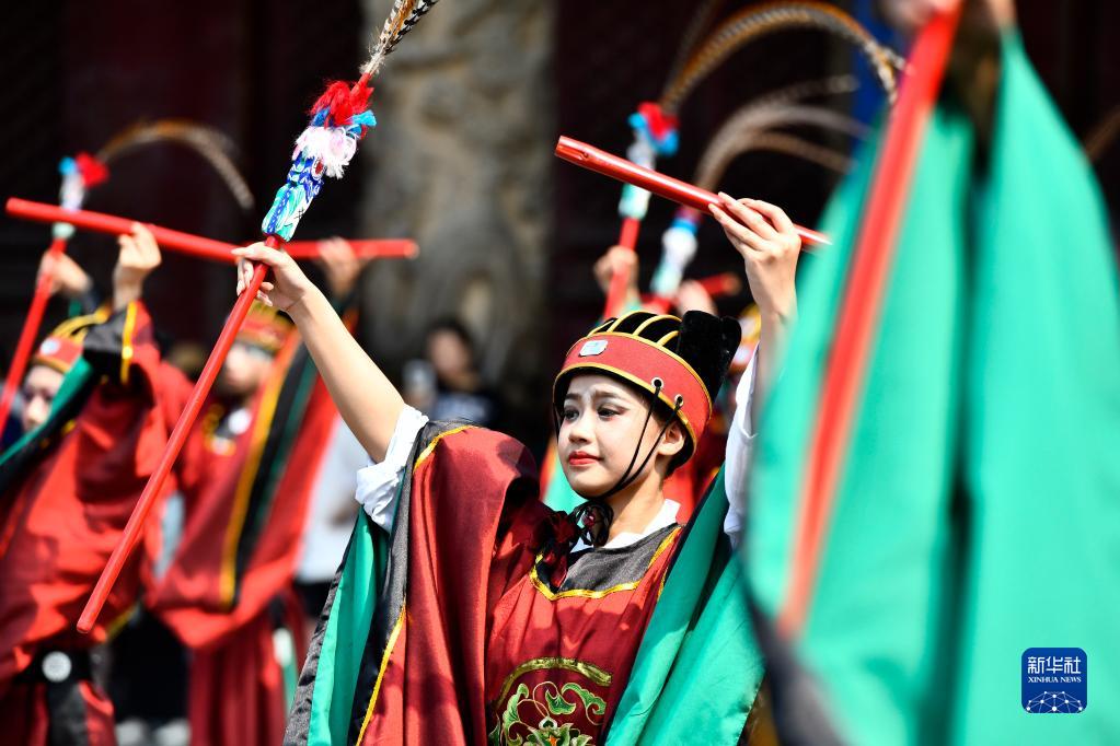 6月27日,在曲阜孔廟,工作人員在表演“八佾舞”。