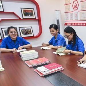 6月27日,胡曉麗(右二)等黨員職工在桐昆集團的工作室內開(kāi)展主題黨日活動(dòng)。