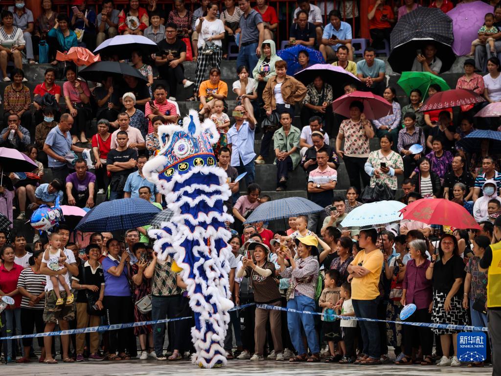 6月27日,在廣西環(huán)江毛南族自治縣下南鄉毛南民族文化園,村民觀(guān)看舞獅表演。