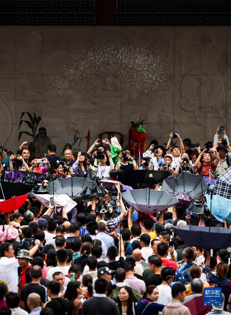 6月27日,在廣西環(huán)江毛南族自治縣下南鄉毛南民族文化園,村民用雨傘接“福祿壽米”祈福。
