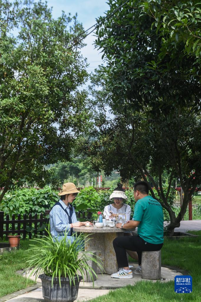 6月27日,游客在浙江省建德市航頭鎮航川村特色民宿的庭院里喝茶休憩。