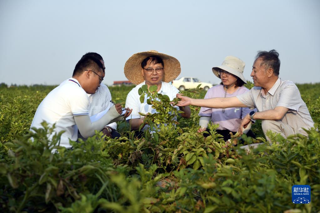 6月26日,農業(yè)專(zhuān)家對耐鹽堿馬鈴薯新品系進(jìn)行測產(chǎn)前的數據收集。