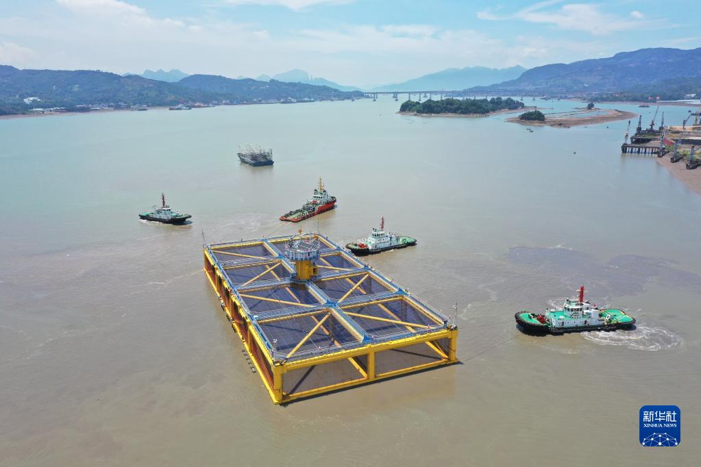 6月27日,在福建福安白馬江上,拖船牽引深遠海養殖平臺“寧德1號”出海(無(wú)人機照片)。