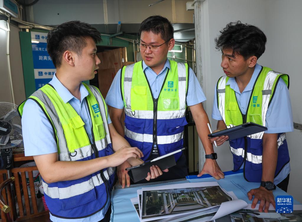 伍濤(中)和同事在項目部研究裝飾施工效果和設計方案還原程度(6月26日攝)。