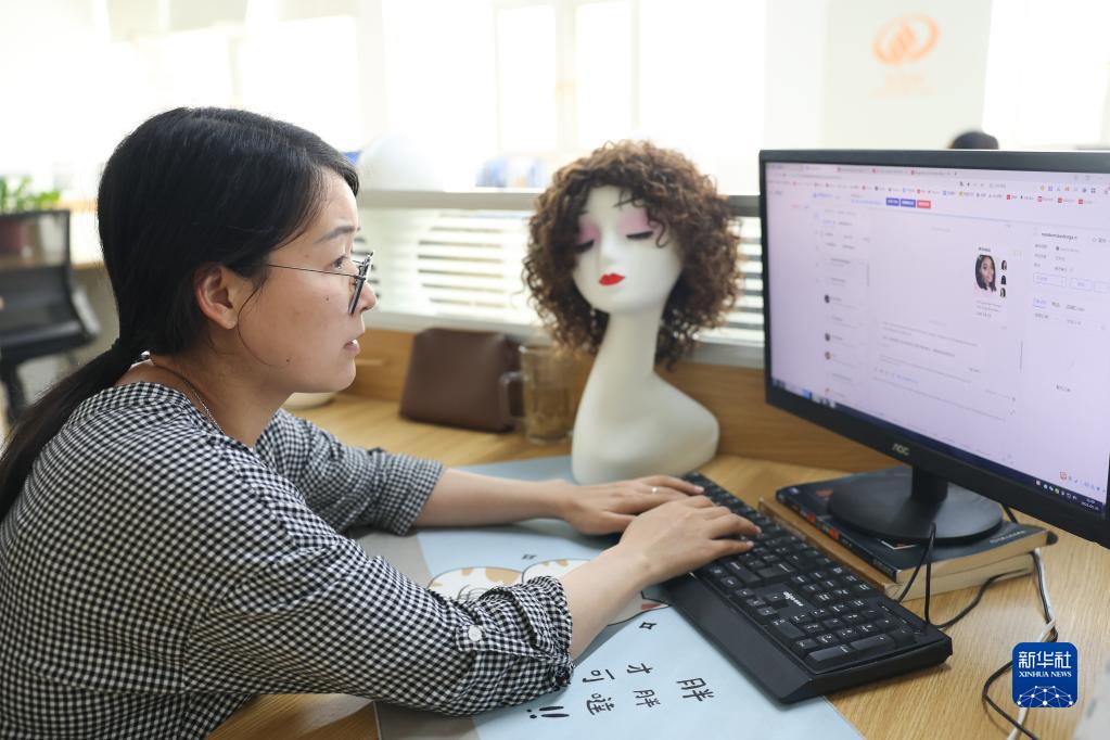 5月25日,工作人員在湖南邵陽(yáng)陽(yáng)光發(fā)品有限公司辦公室內通過(guò)電商平臺向海外銷(xiāo)售假發(fā)。