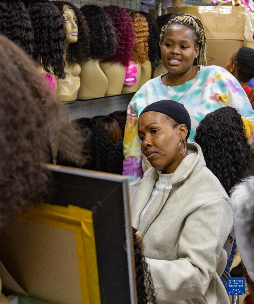 6月9日,在湖南邵陽(yáng)陽(yáng)光發(fā)品有限公司位于南非約翰內斯堡的店鋪內,顧客試戴假發(fā)。