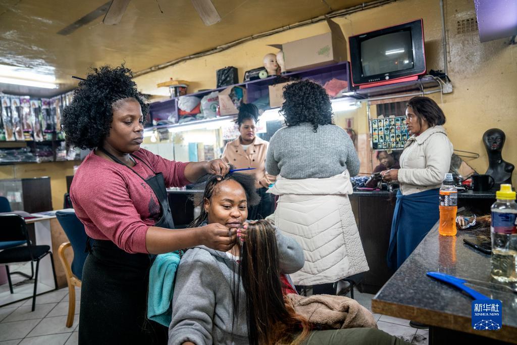 6月12日,在南非約翰內斯堡,美發(fā)師在美發(fā)店內利用假發(fā)為顧客造型。