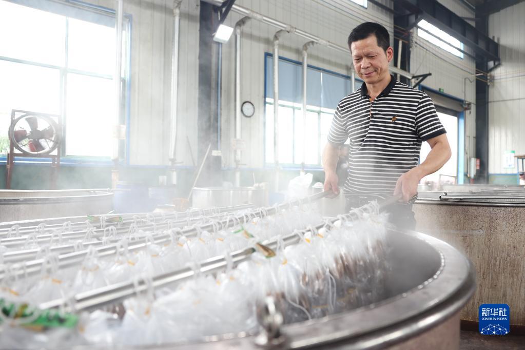 5月25日,工人在湖南邵陽(yáng)美麗來(lái)發(fā)制品有限公司車(chē)間內給假發(fā)染色。