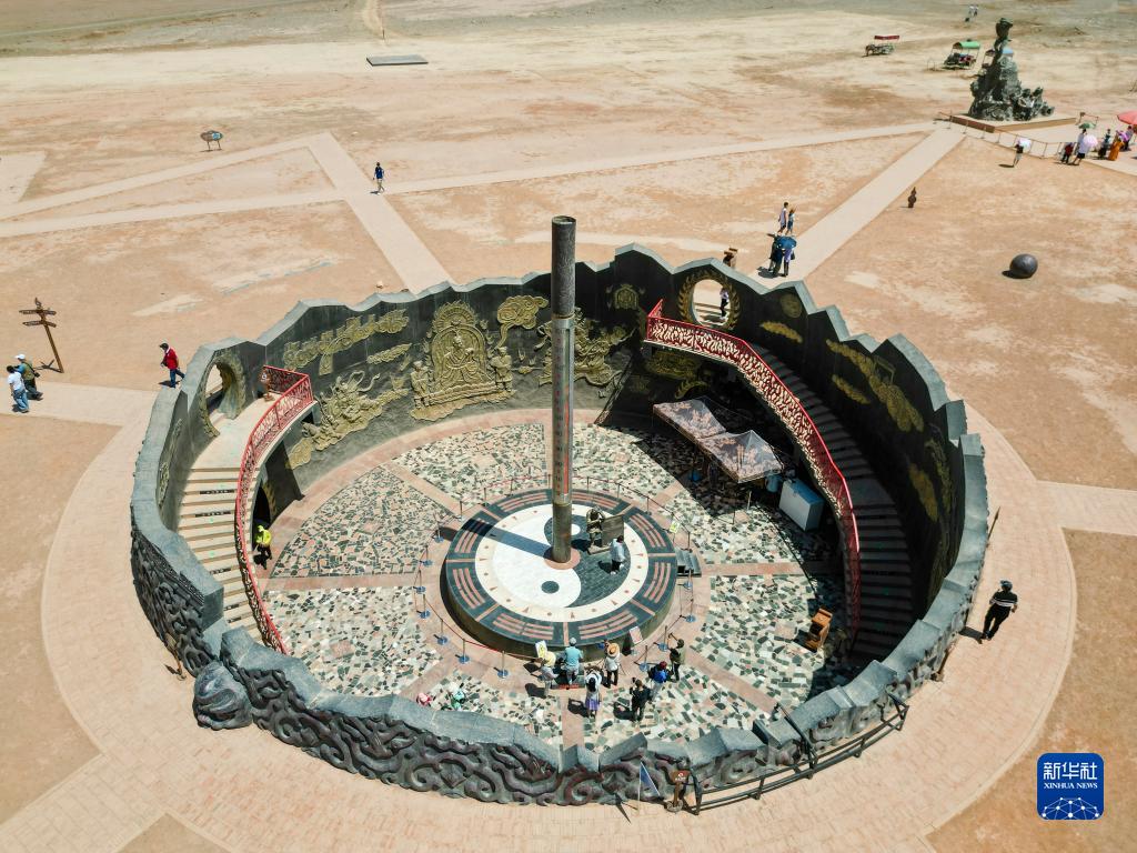 游客在位于吐魯番市的火焰山景區游玩(6月27日攝,無(wú)人機照片)。巨型溫度計顯示當時(shí)火焰山景區地表溫度約為65攝氏度。