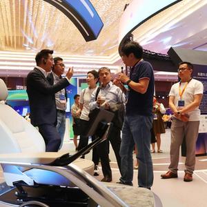 6月28日,參觀(guān)者在峰會(huì )展示區內的一個(gè)智能駕駛座艙展位前交流討論。