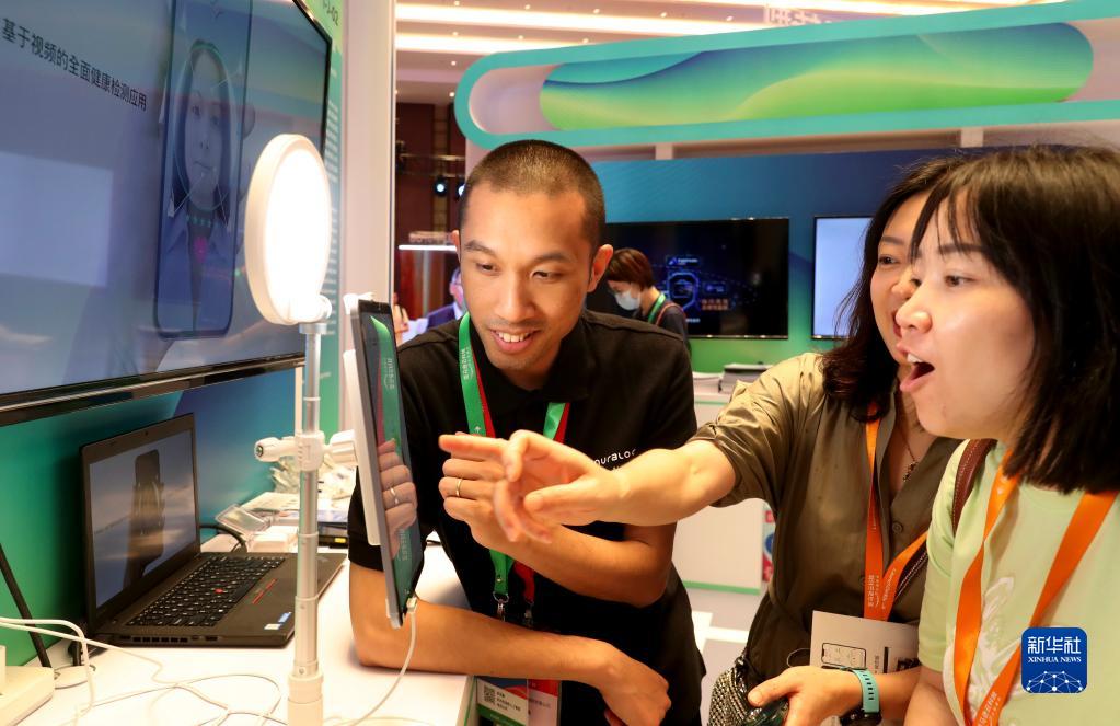 6月28日,工作人員(左)向參觀(guān)者介紹一個(gè)人工智能掃臉健康檢測設備。