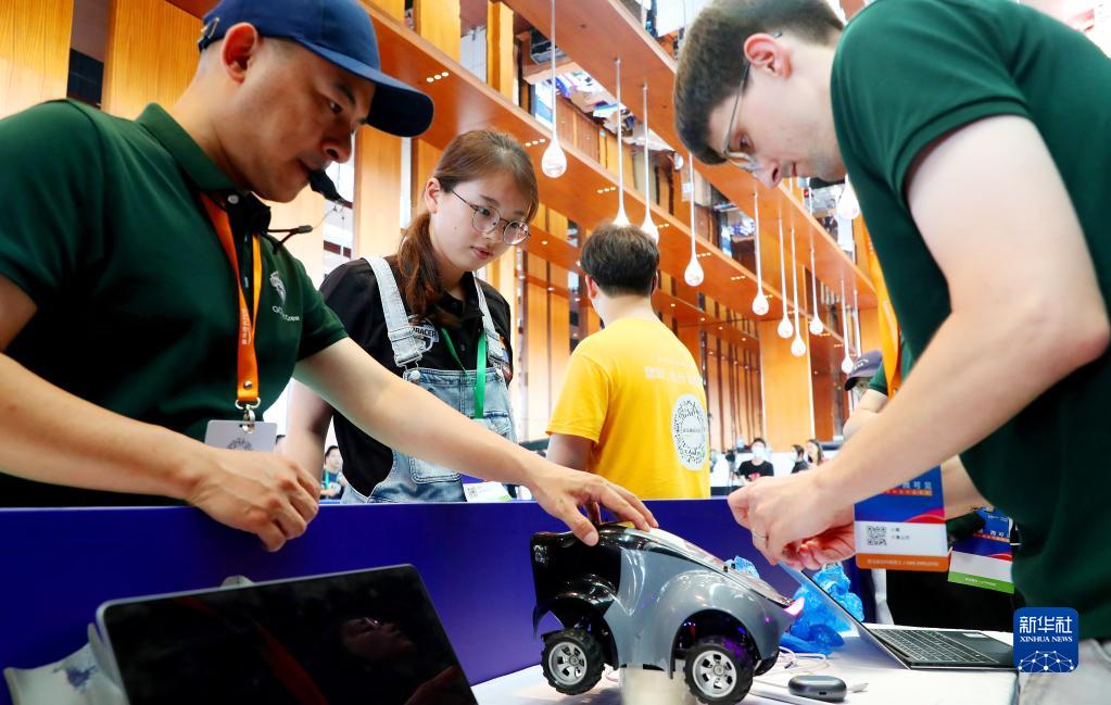 6月28日,來(lái)自華東師范大學(xué)的全自動(dòng)駕駛賽車(chē)參賽選手(左二)在比賽前等待工作人員安裝統一的車(chē)輛外殼。