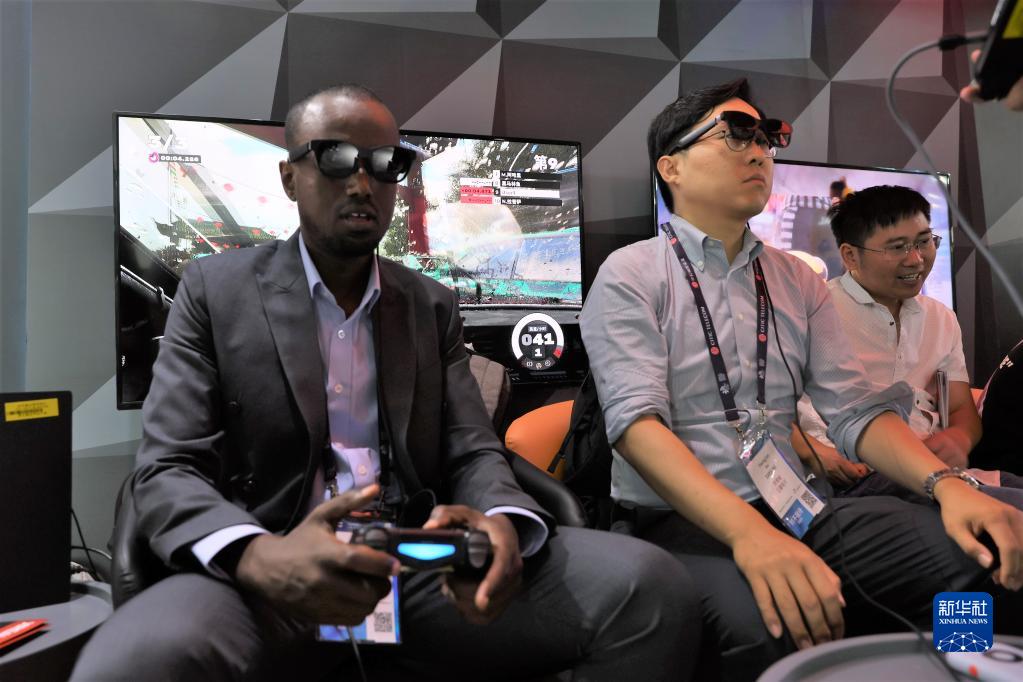 6月28日,人們在XREAL展臺佩戴AR眼鏡試玩游戲。