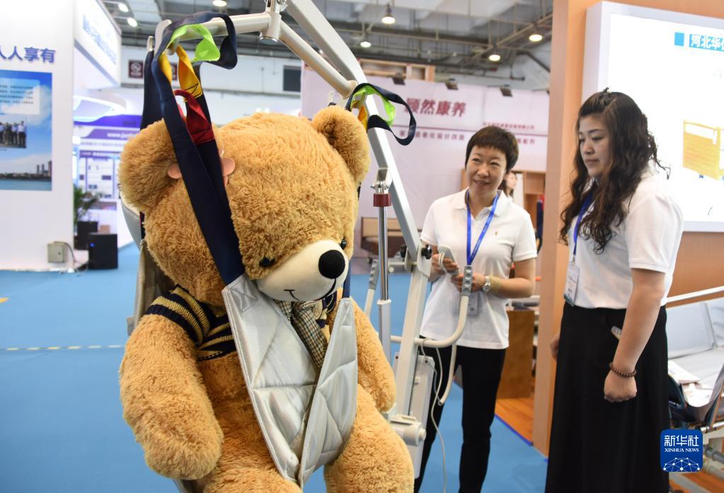 6月29日,一家參展企業(yè)工作人員在展會(huì )上展示一款護理電動(dòng)移位器。