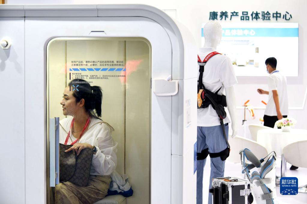 6月29日,一名參觀(guān)者在展會(huì )上體驗微高壓氧艙。