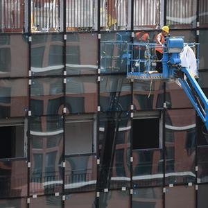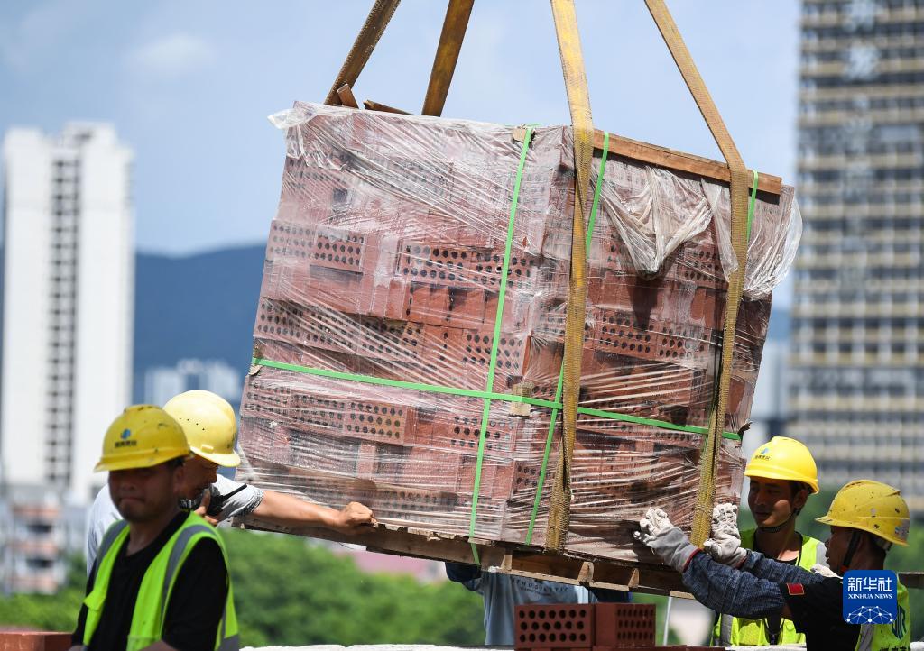 6月29日,在中建三局承建的西安電子科技大學(xué)廣州研究院項目工地,工人在協(xié)助吊裝材料。
