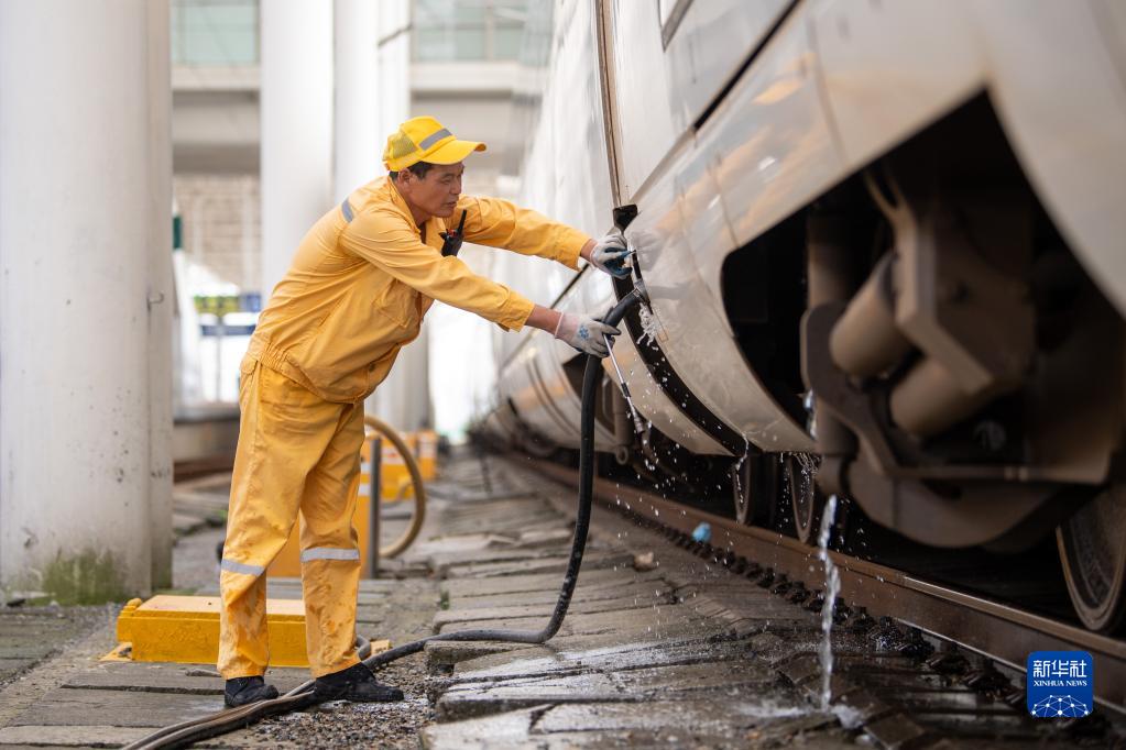 6月29日,溫州保潔工區的工人對??繙刂菽险镜母哞F列車(chē)進(jìn)行上水卸污作業(yè)。