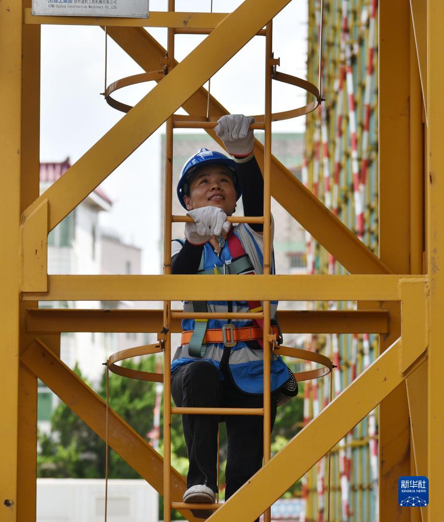 6月29日,張軍麗在項目工地攀爬塔吊。