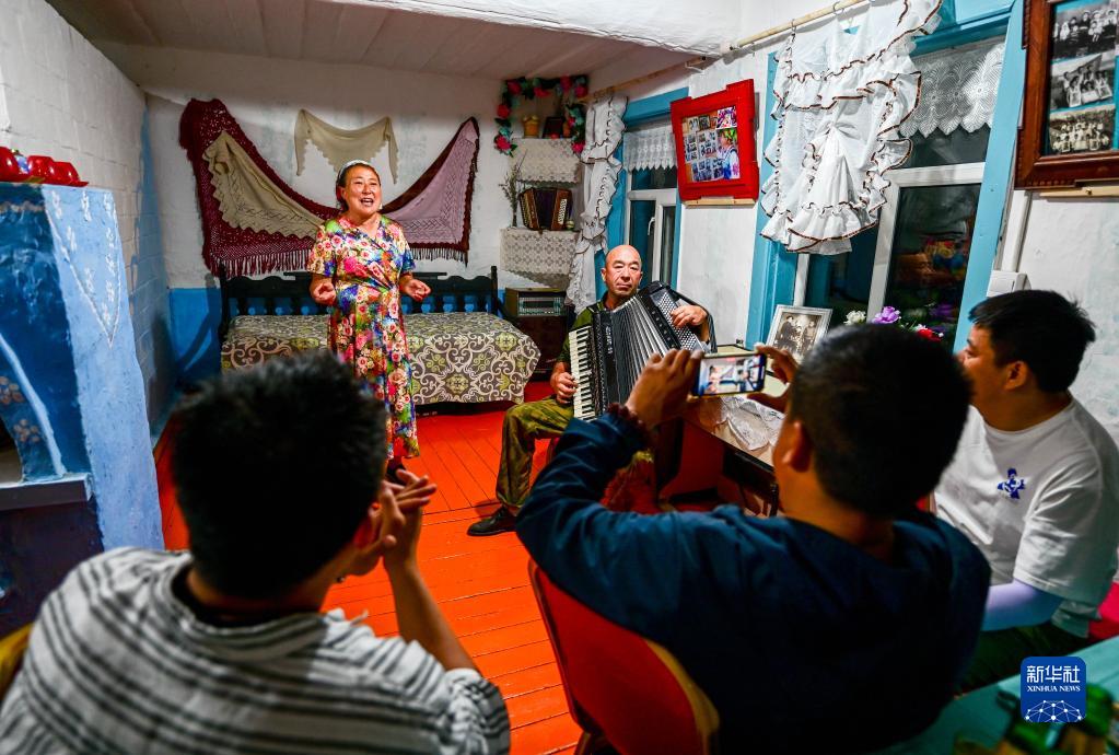 6月28日,考占花(左)為游客們唱歌,薩沙在拉手風(fēng)琴??颊蓟ㄊ嵌砹_斯族,2004年開(kāi)始經(jīng)營(yíng)俄羅斯族家庭游。