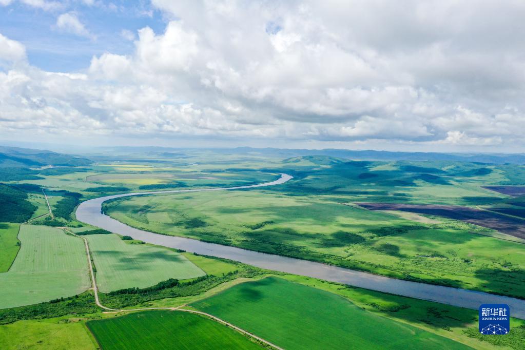 6月29日拍攝的額爾古納河風(fēng)光(無(wú)人機照片)。
