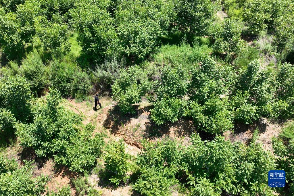 6月30日,賈志華在河北省臨城縣賈莊村查看核桃長(cháng)勢(無(wú)人機照片)。