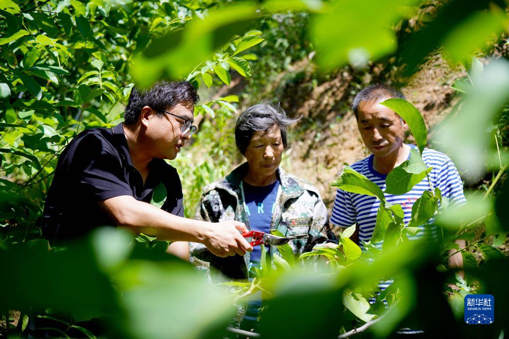 6月30日,賈志華(左)在河北省臨城縣賈莊村為農民講解核桃樹(shù)的夏季管理知識。