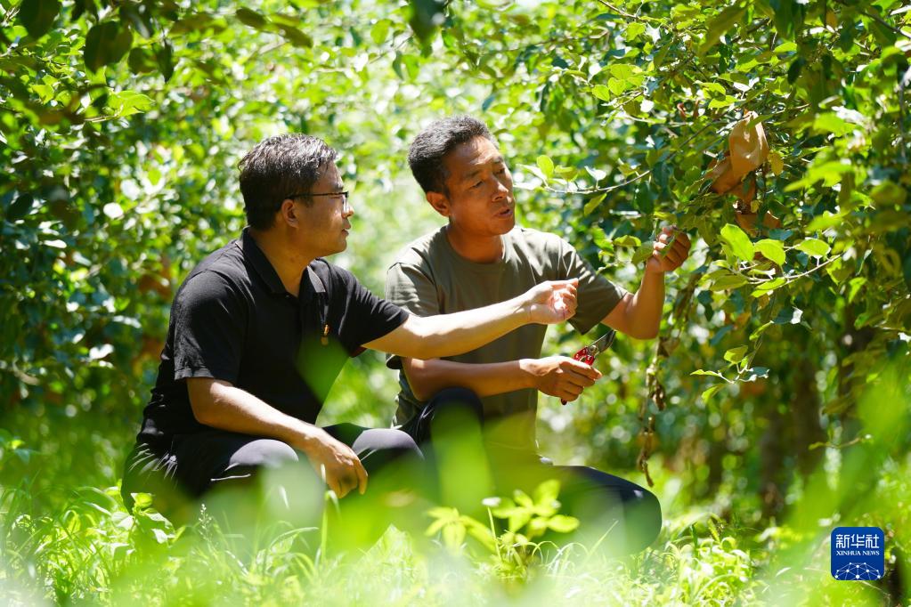 6月30日,賈志華(左)與隊員梁國軍探討蘋(píng)果夏季管理方法。
