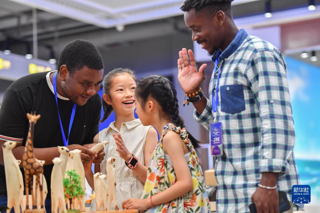 6月30日,在中非經(jīng)貿合作促進(jìn)創(chuàng )新示范園(湖南高橋大市場(chǎng)),來(lái)自津巴布韋的志愿者博特·德西雷(左一)和來(lái)自加蓬的志愿者阿羅伽(右一)向小朋友介紹展品。