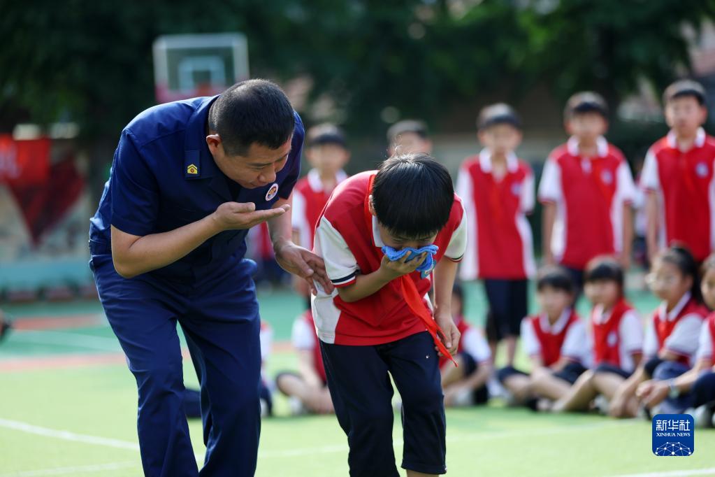 6月30日,山東省臨沂市郯城縣消防救援大隊宣傳員為紅旗小學(xué)學(xué)生講解火場(chǎng)逃生方法。
