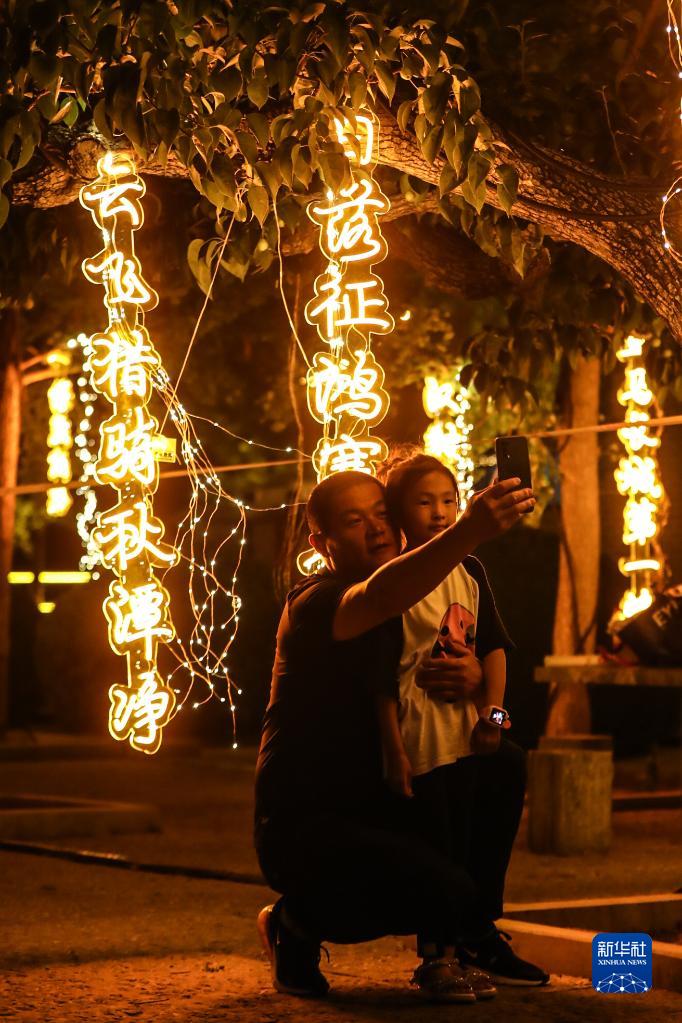 6月30日,游客在葫蘆島市綏中縣九門(mén)口長(cháng)城景區內的古詩(shī)詞彩燈前拍照留影。