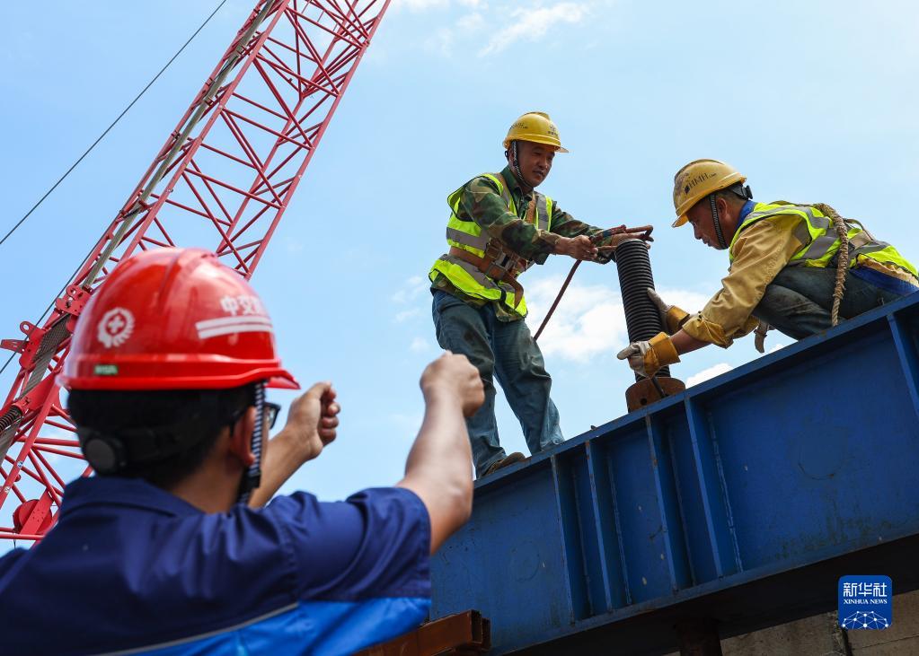 中交路建黃茅??绾Mǖ理椖奎h員安全先鋒小組安全員提示高空作業(yè)人員合理綁扎安全帶(6月29日攝)。