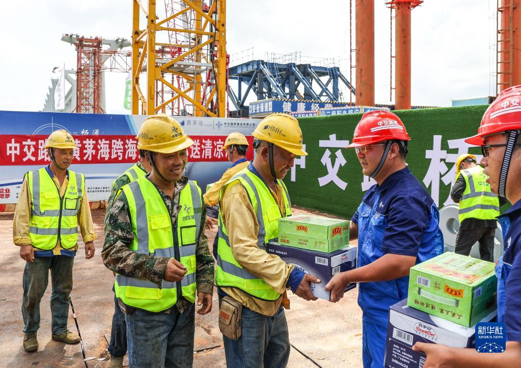 中交路建黃茅??绾Mǖ理椖奎h支部為現場(chǎng)施工人員送清涼(6月29日攝)。