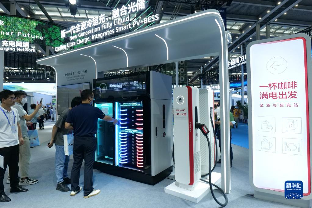 6月30日,觀(guān)眾在了解全液冷超充示范站。它最快能以“一秒一公里”的速度充電。