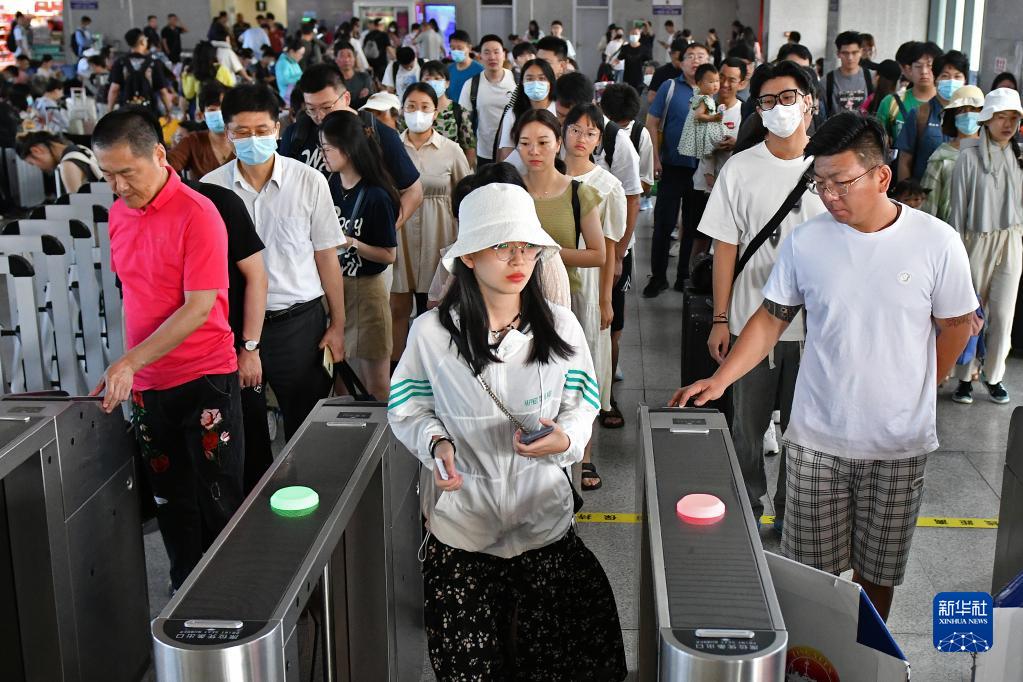 7月1日,旅客在山東煙臺南站通過(guò)閘機進(jìn)站乘車(chē)。